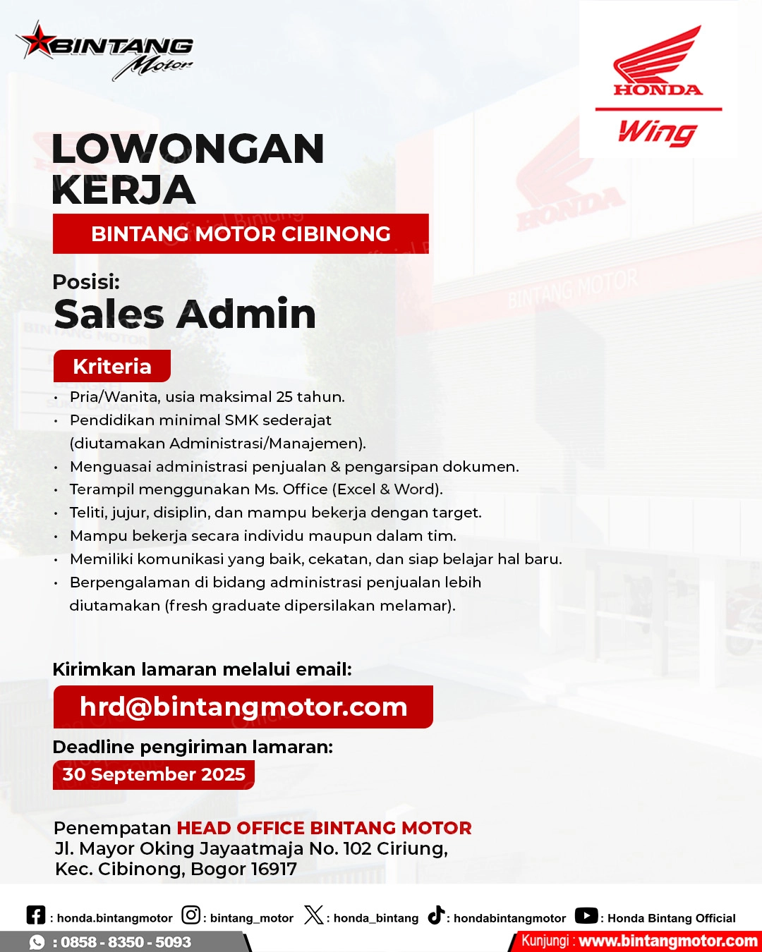 Berpengalaman di bidang administrasi penjualan lebih diutamakan (fresh graduate dipersilakan melamar).